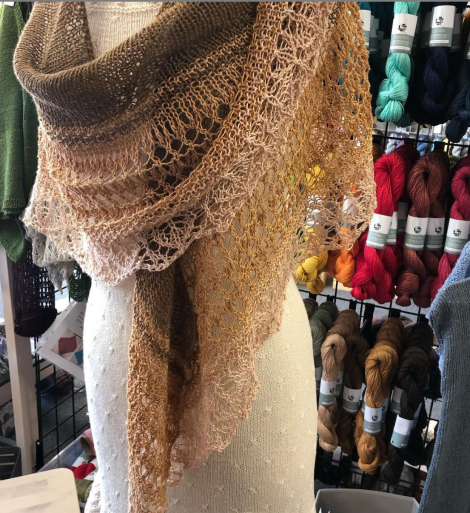 The Zambra shawl by Susanna IC features three Euroflax colors. Choose your own favorites for your unique shawl. The pattern is available on Ravelry